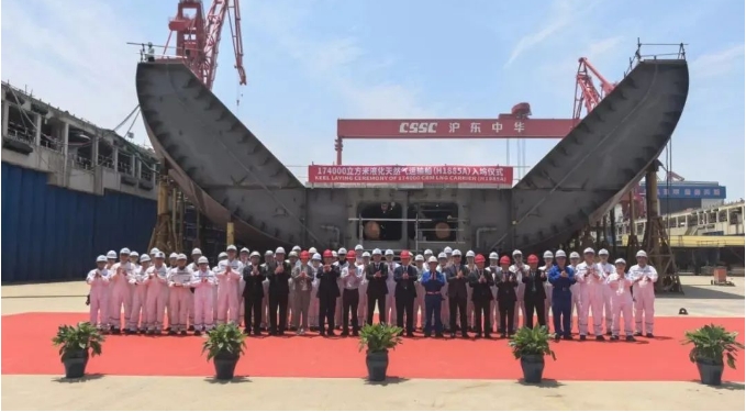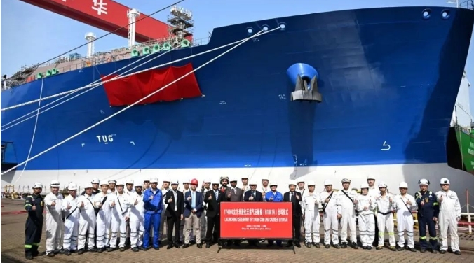 17.4萬立方米LNG運(yùn)輸船“遠(yuǎn)海奮進(jìn)”號(Ocean Inspiration)在滬東中華新廠區(qū)正式命名。